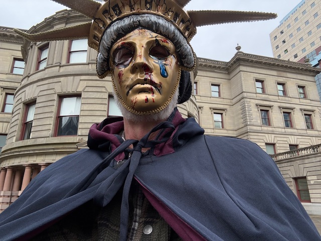Long story short, I decided to stage a one-man protest on the steps of City Hall, which is closed on Saturdays, it turns out, but I did not let that deter me. I stood there, without moving, for almost an hour. Because that is how long I paid for parking. I just let my eyes rest, and let the battered Lady Liberty speak for herself. I faced the oncoming traffic, and just kept my face, and the mask, slightly lowered.