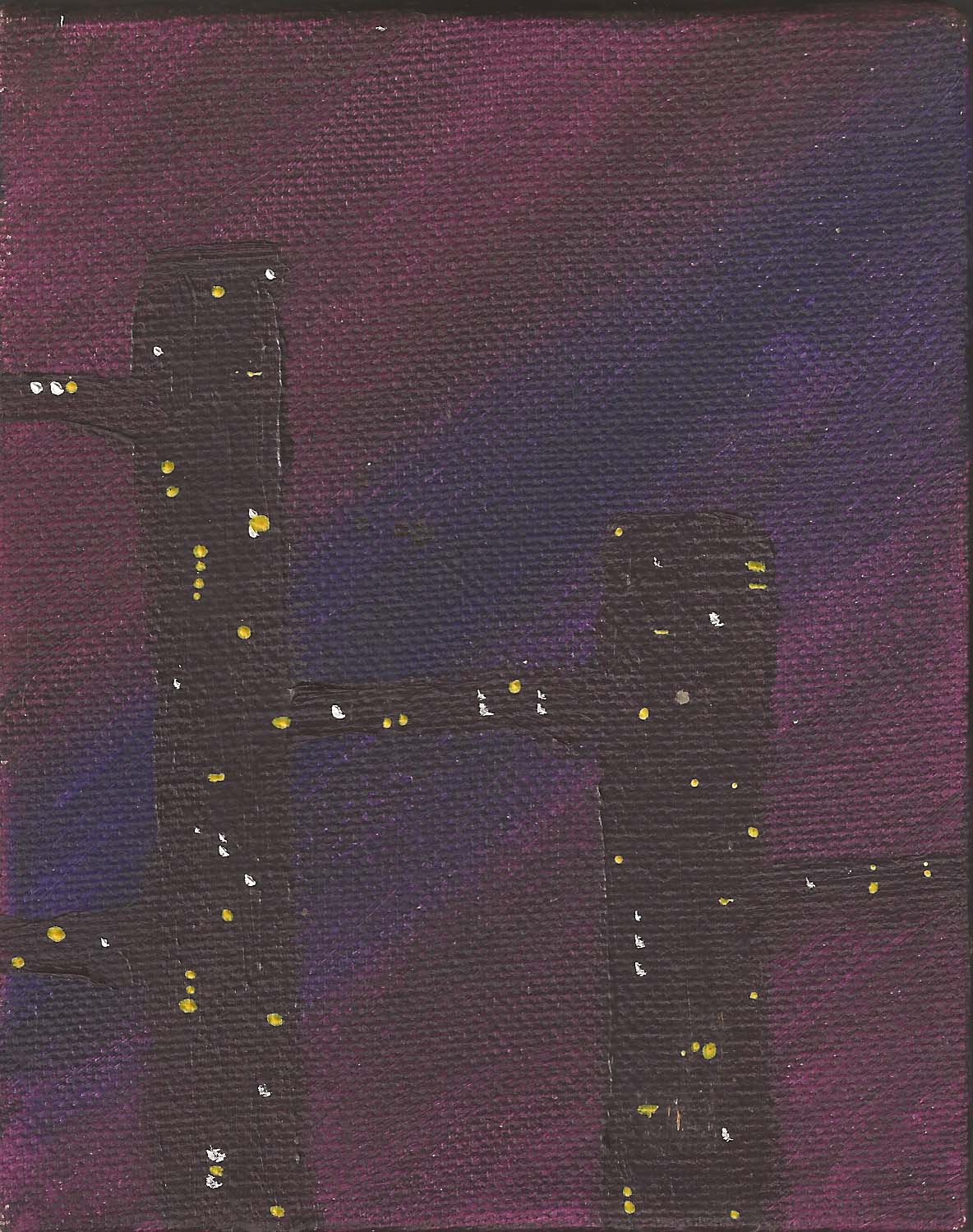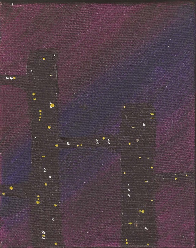 Last and perhaps least… (because this oil painting is on a four inch wide canvas, and because I am just going around the garage in a clockwise direction taking stuff off the walls, so some of these are from earlier in my artistic development and not anything to rave about)… is a small alien city.