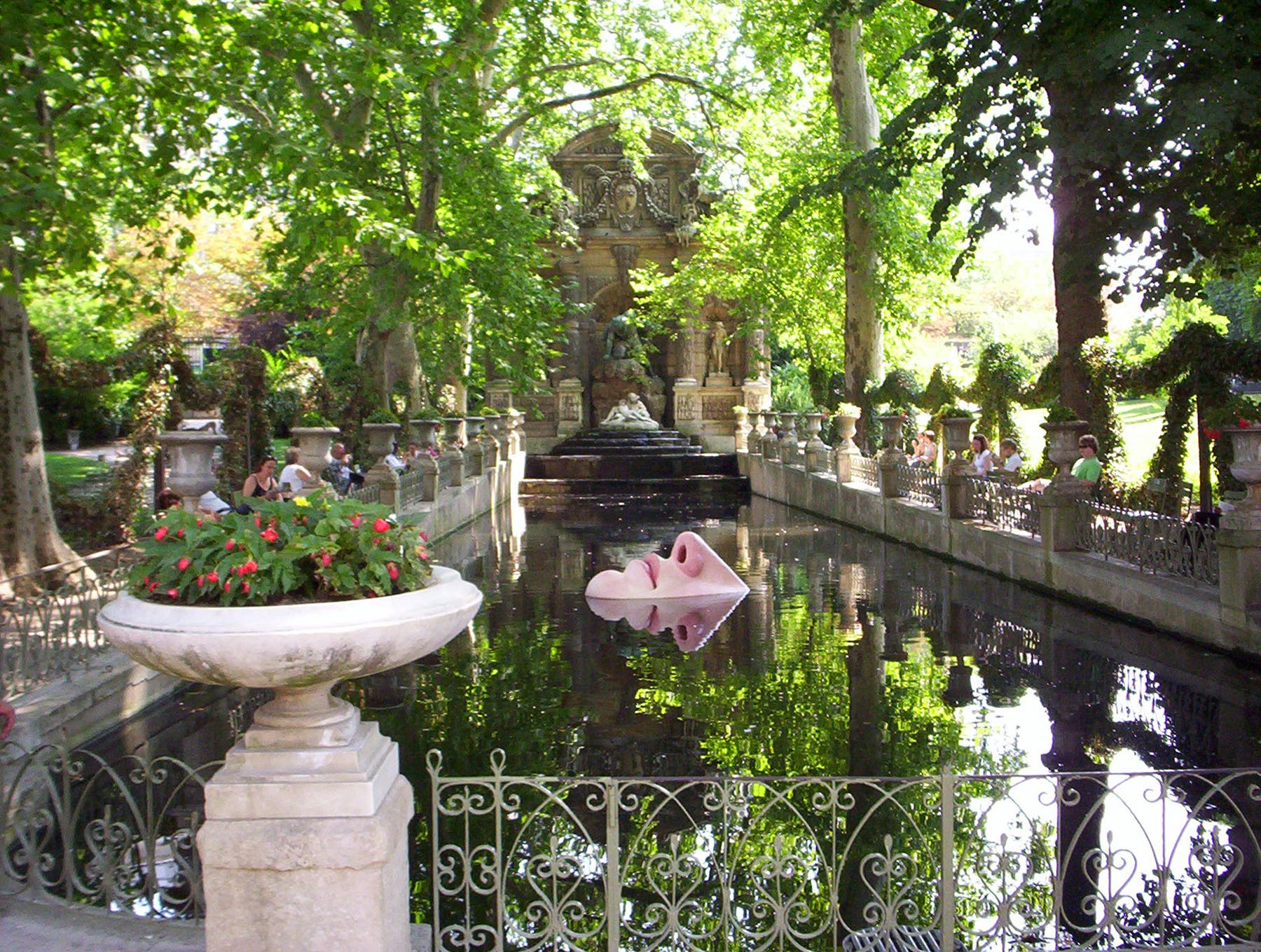 I did not Photoshop this picture. A French artist put the big face in the little reflecting pool. Artists are cool.