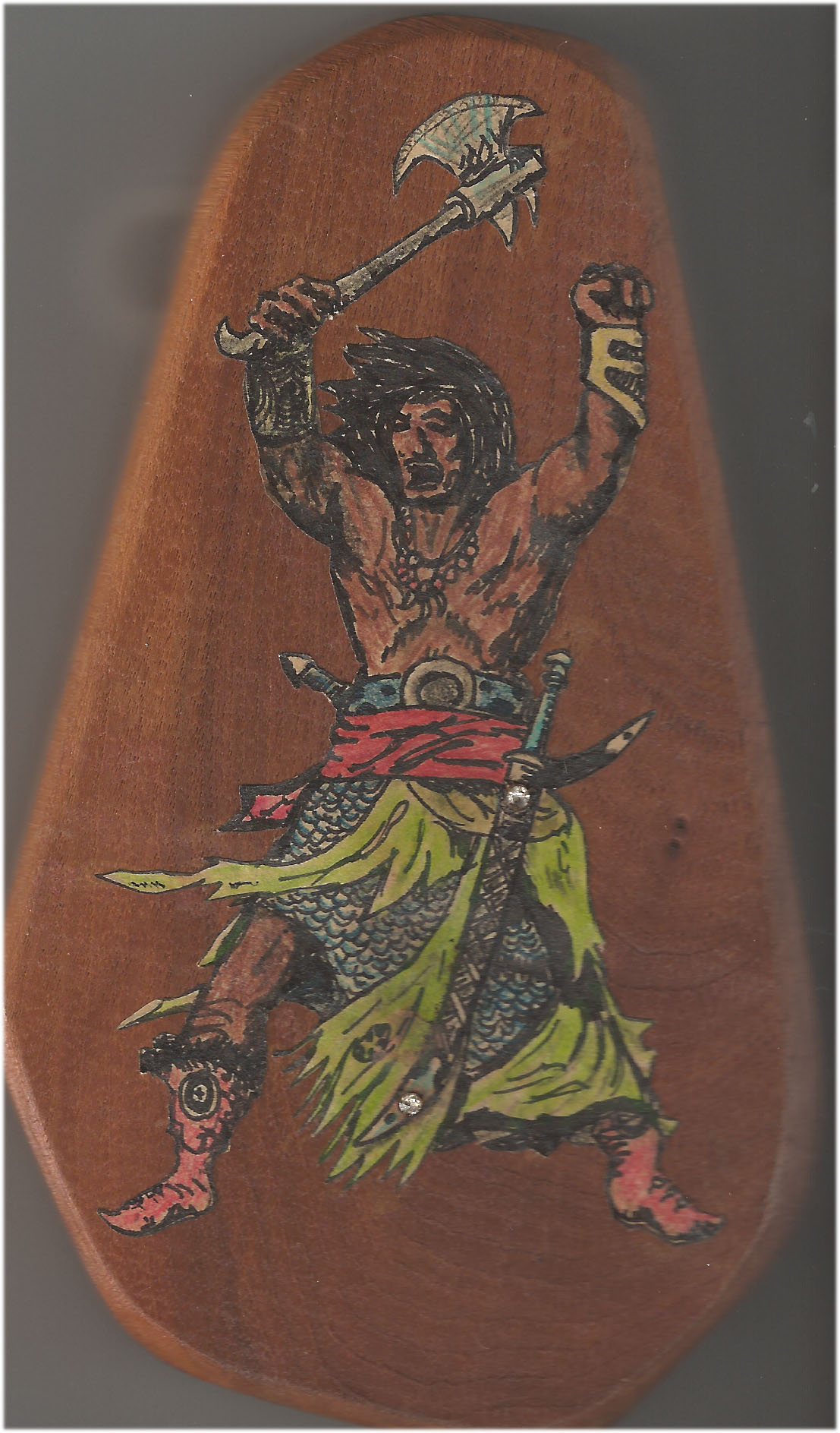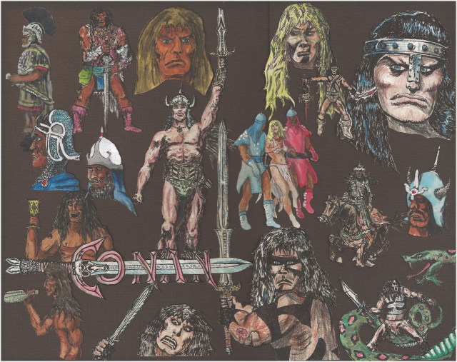 Here is another smaller ode to Conan that I cut out, inked and colored, and then mounted on a piece of wood. The big picture above this one is about 14 inches by 11 inches. This one is about 6 inches tall, so that is more like life-sized. I guess if you click on these pictures you can see a bigger version. Or maybe that only works on some of them. I don’t know. I am a computer moron, remember?