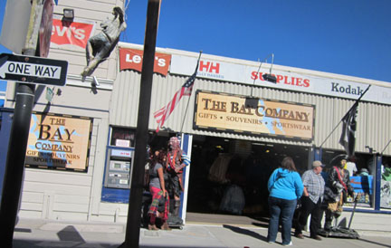Mixed in with the tourist traps you can still find working fishing boats, and Ghirardelli Square where you can get good chocolate. And you can get clam chowder in a bowl made of real sourdough bread made from yeast cultures that were in the city back in the gold rush days. As we drove I was just taking pictures out of the window and I saw this strange scene. There was a real lady who looked like she was chatting with a statue of a pirate.