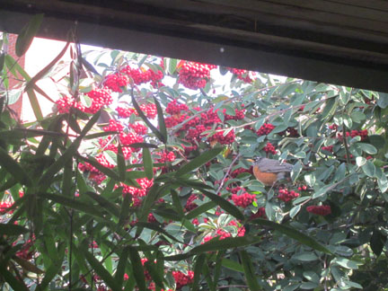 These berry trees… whatever they are called… are very common in the Bay Area. When the berries have aged a bit, they seem to make the robins drunk. This fat little fellow stayed on that branch for more than a half an hour, gobbling down those berries at an incredible rate. Then he would stop eating for a minute or two before starting in again. When was the last time you ever saw a bird stay in one place for that long?