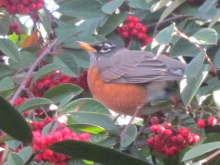 While I was in my mom’s computer room/office, trying to type my blog posts on a computer that I do not know how to use and that kept getting booted off the internet, I happened to spot this robin in the tree outside the window…