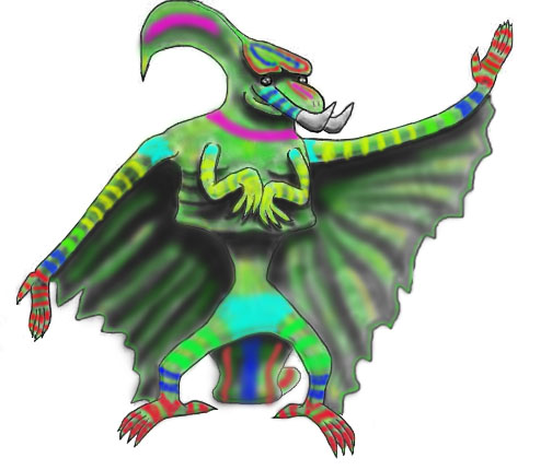 We created an alien, taking her from a rough pencil sketch which we scanned and played with in Photoshop, and turning her into a living, breathing creature. So now I am just going to have some fun with colors. Here is Fawnya, ready to go to a dance with her husband, wearing the party paint of her people…