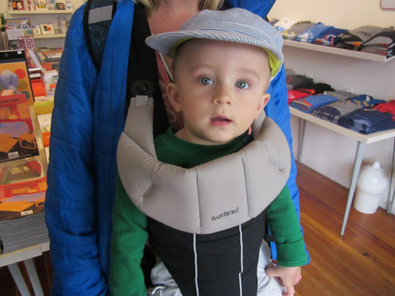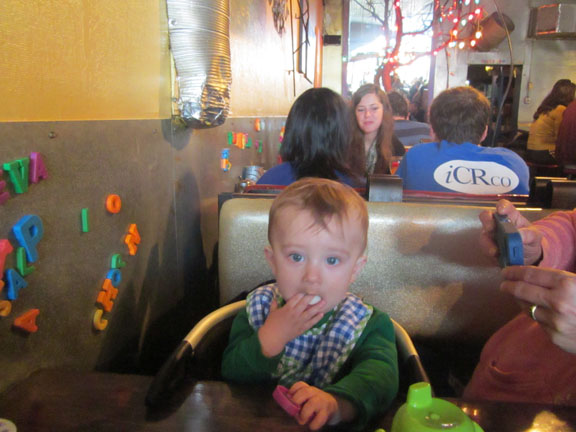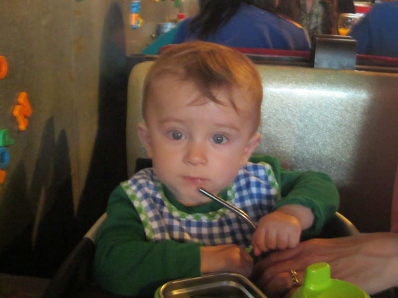 Look at my little buddy. He has his bib on. He is ready to go out for some lunch. And that is exactly what we did.
