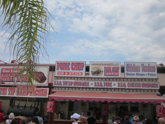 a 13Pork chop on  a stick. Right in front of the pig races. You gotta love America. And I have to admit that I get it. When I go to Sea World, I like to order a fish sandwich for lunch. We went to an ostrich farm once and fed the ostriches. And then I bought a package of ostrich jerky. I like to tie in my food with what I am doing. It makes the whole experience sort of three-dimensional.