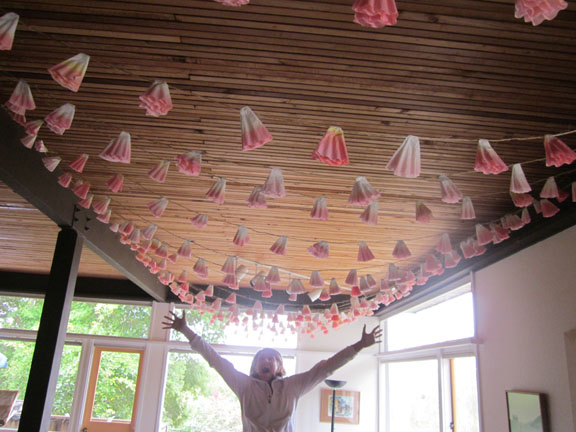 Jessica also put us to work folding all those hundreds of dyed coffee filters and stapling them to twine. My brother Sid and I then stapled the vines to the ceiling. Here is Jessica showing how excited she is about the end result. She jumped right into my photo.
