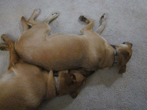 Those buddies look like litter mates. Love how they play together! My yellow lab Daisy sleeps on her back with her paws up and her fangs out. Dogs are most definitely weird, which is why I’m a dog person, and presumably why you are one, too.