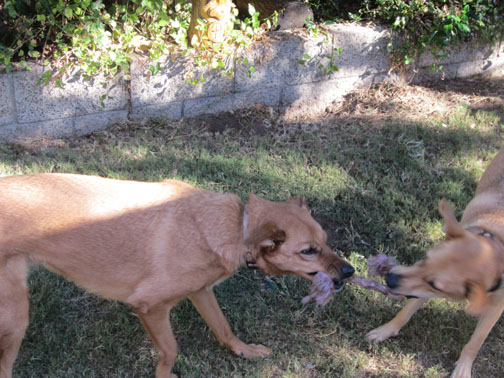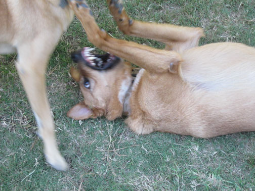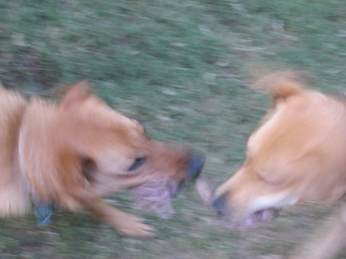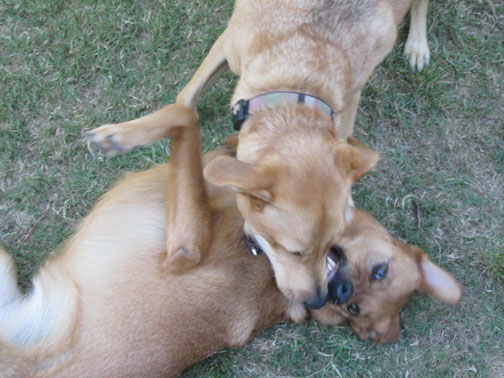 They are both sweet, nonaggressive dogs. But they gnaw on each other like wild wolf pups. And sometimes, when I look at them playing like this, I can really see the wolves that they are descended from…