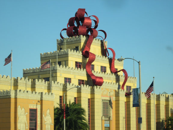I did see a building decorated as a giant Christmas present, and that made me smile. And then, as we stopped one last time for gas just past Los Angeles, we saw the sky beginning to glow with fire.