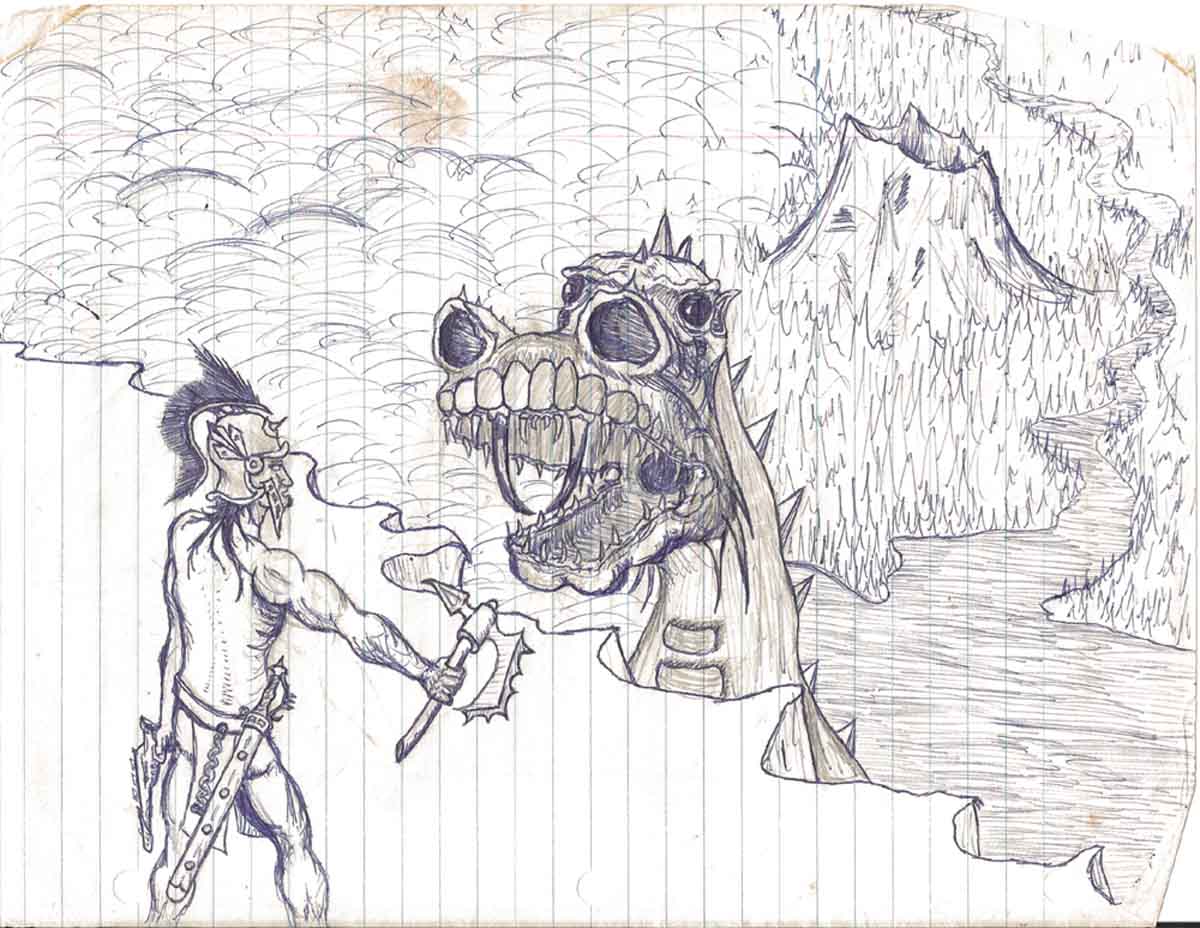 When I was 13 or 14, I began my career as a voracious reader, and I read a lot of fantasy and sci-fi. So a lot of my early art involved heroes with swords or ray-guns. I really loved the Conan the Barbarian books and comics, so I spent a lot of time drawing that steely eyed Cimmerian. We will dig deeper into my fixation with Conan later, because I used most of the pictures for other things, but for now it is enough to say that my lizard-fighting heroes gradually developed…(that is not a muscle pun)… but now that you mention it, muscles, faces, heck, most of the human body is not easy to draw without lots of practice… (If you will forgive me for saying so, women’s breasts are quite challenging, whether covered or not… so rather than drawing boobs all day, I mostly just ignored them…[artistically speaking])…
