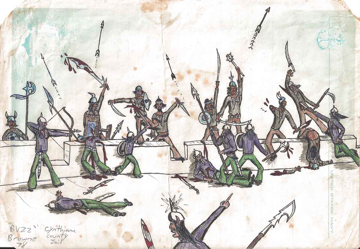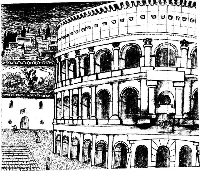 I was in Rome with my youngest brother, Sid, and I started a quick sketch of the coliseum… this was back in the early 80′s… When I got home, I decided to finish the picture as I imagined the coliseum would have looked back when it was still being used. The picture is too big to scan completely. It is folded and faded, and not all that good. But I have it hanging in the garage…(where, for some reason, my wife insists I hang any of my art that I feel I need to)… and when I look at it, I remember that trip, and Rome, and I say to myself, ‘that is way better than a photograph in an album that I never look at’. And I did it all by myself.