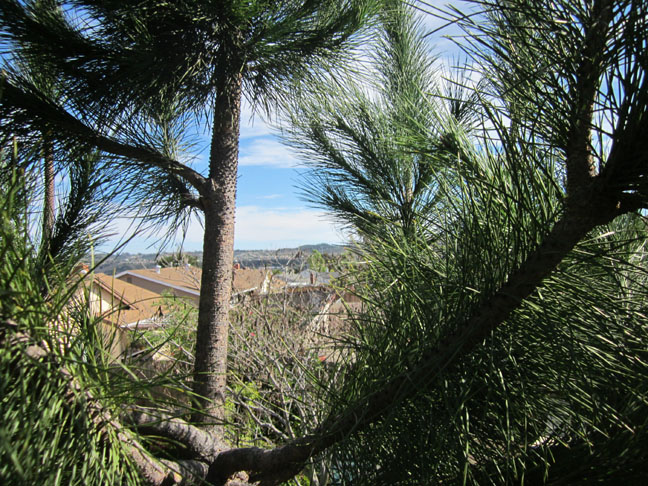 This tree used to be just a few feet tall and lived in a pot. We used it as a Christmas tree for a few years. When we bought our house 14 years ago, I planted it in the yard. And now it is getting really tall. And I am trimming it so I can build a tree house.