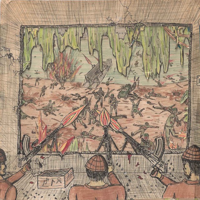 This strange picture of a Japanese machine gun nest is actually a 3D diorama. The background with the U.S. Marines landing is mounted on a bent arch. The guys in the bunker are cut out so you can actually look past them… Unfortunately, the scanner cover squashed the whole thing, but maybe you get the idea…