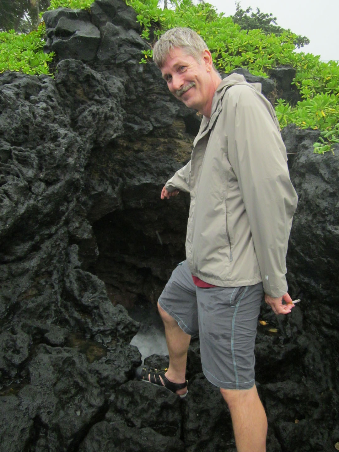 Oh yeah, look at me in my action/adventure tourist gear… what a goober… but I was having so much fun. This big chunk of black lava sticking out into the tumultuous sea was right below the hotel. We met these two cool locals who were fishing from these rocks with multiple poles. It turned out that they fished late into the night, because we could see their flashlights moving around in the darkness. I took this picture from the same place…