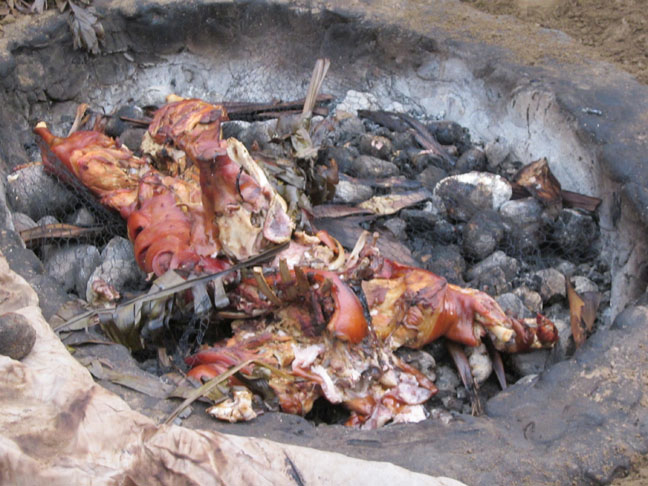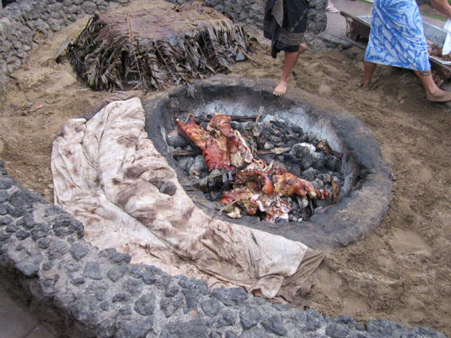 I want to eat stuffs buried in sand. And WHAT?! No girls in grass skirts?! I am seriously tempted to disown you this instant….