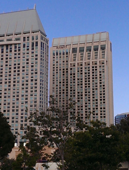 We ate at the Hyatt… way up at the top, where those big windows are, over at the right…