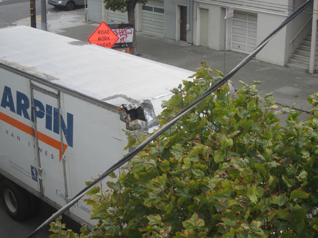 We tried to get Willie to take a nap. While we were waiting for him, I took this picture out of the window of a moving van parked on the street outside. I think it might have had a run-in with a low bridge. The moving company should use this as their slogan: We keep all your stuff safe and in perfect condition… unless it rains…