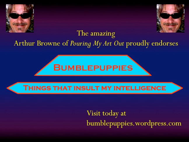 This piece of art was done by my pal Bumblepuppies at: http://bumblepuppies.wordpress.com/ and I must admit I have to admire the way he took my art contest rules… you know… about how the artwork had to be about me and/or my blog… and turned them sideways… and managed to make my self-absorbed contest almost as much about him as it is about me…