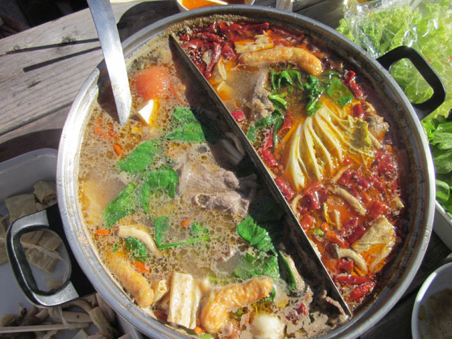 You could stick whatever you wanted to in either the spicy side or the not-so-spicy side, and let them cook for a little while, and then add them to your soup bowl…