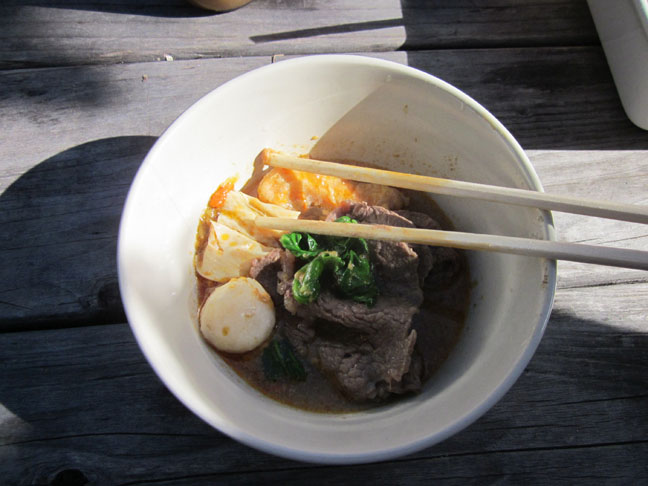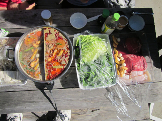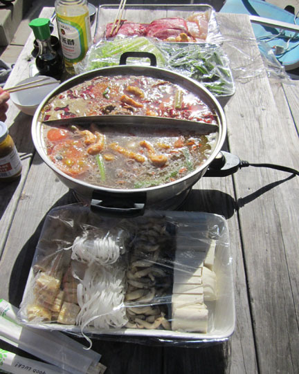 It was a big hot-pot with beef and chicken and fish balls and shrimp and all kinds of vegetables…