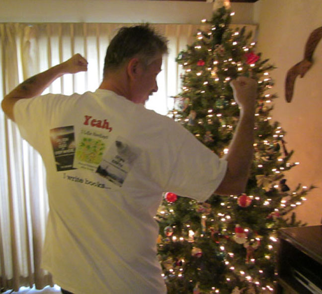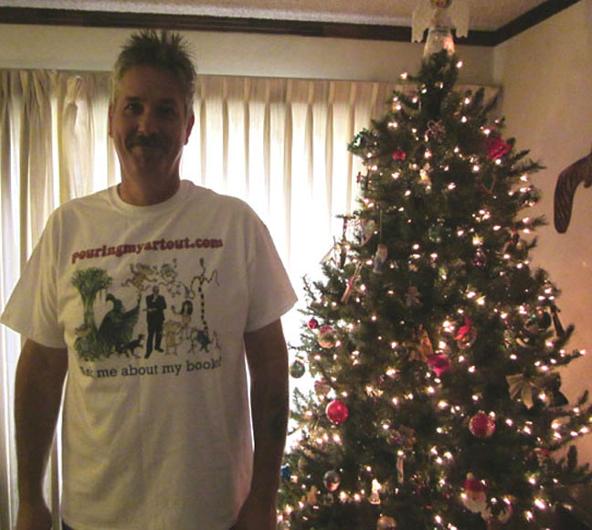 Okay, it is a lousy picture. I am back-lit, so you can’t see me… or the shirt very well… (It says ‘Ask me about my books’)… but I guess you should remember the picture from the post I did about it when I was doing the layout. And I just got out of the shower and my hair is standing up like a hedgehog. I lays back down as it dries, just so you know.