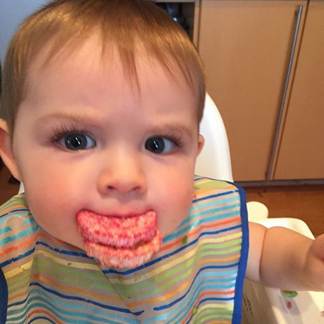 I can barely force myself to look at the pictu…. wait… it turns out he was just eating two little rice cakes. I don’t know what the red color is. Maybe they are strawberry flavored or something.