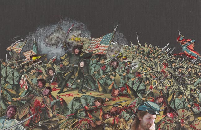 I think you show yourself to be a maniac by cutting up photos of yourself for a painting. The war here is just history. I’m hoping that’s not real blood. But nice cotton ball smoke.