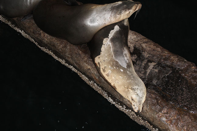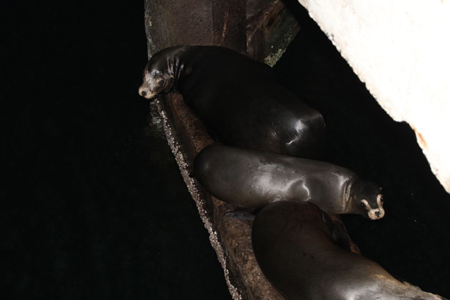 And I could hear some large sea mammals barking underneath the pier… and this is the first time I risked my life for you… to climb way out onto the wooden bumpers on the side of the wharf and hang over the cold water to get these pictures of sleeping seals…