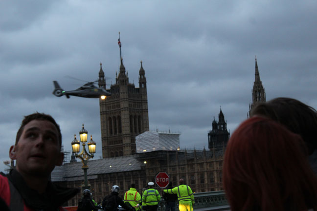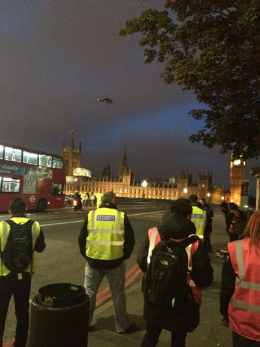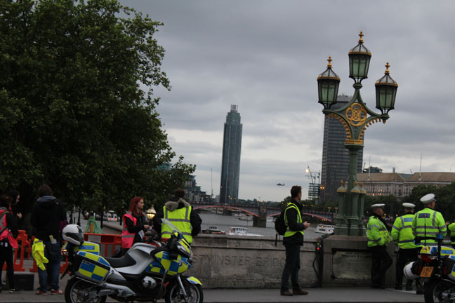 I had just gotten my mom settled in when they called to tell me to get down to the bridge by the Parliament building as fast as I could. I hoped in the ubiquitous London black cab, and met up with them in time to see all this excitement going on.