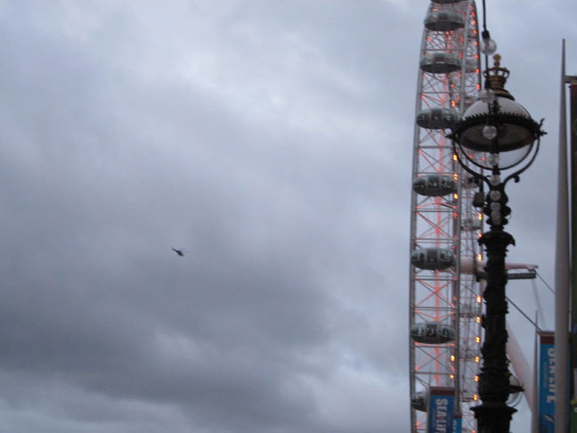 They were shooting a scene from a James Bond movie. They kept closing down the bridge, and then these helicopters would swoop down the river Thames and pop up right by Big Ben, pass over the bride, and then zoom away.