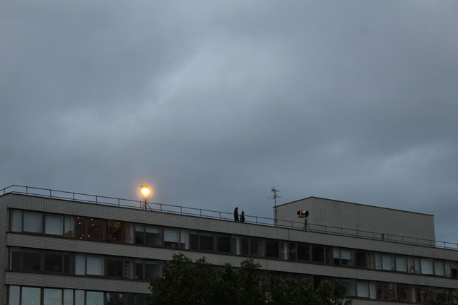 They had spotlights set up on the roofs of buildings.