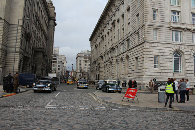 a 4Turns out that this street in Liverpool has buildings that look more like New York in the 1940’s than anyplace in New York. So they kept closing down the street, and resetting all these old cars and all these movie extras and the two soldiers, and making them relive the same moment over and over.