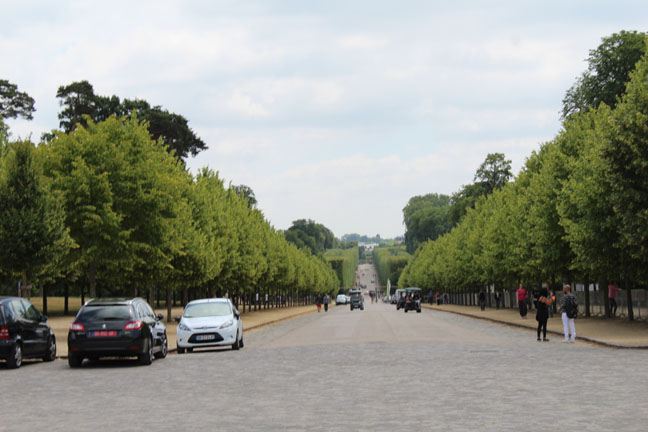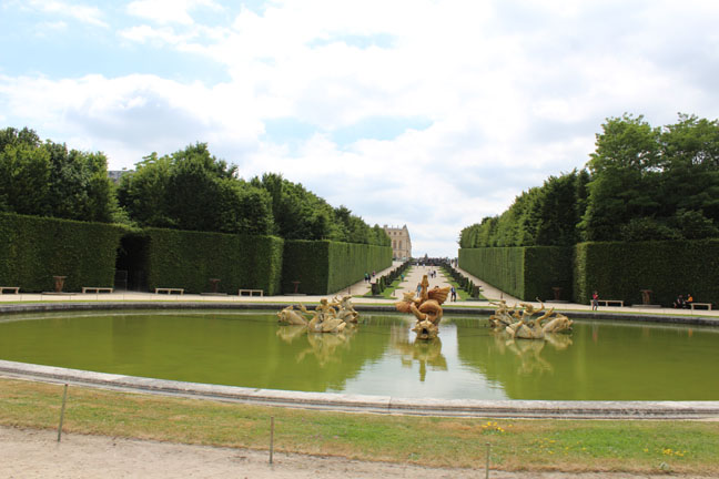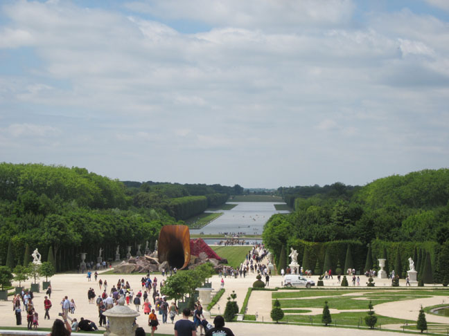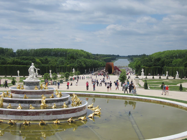 a 9See that water feature in the distance? That is an artificial lake, built so that guests can take boat rides on warm summer days. Those side branches are artificial rivers that lead to more huge round artificial lakes. All those statues and urns are much bigger than you might think from this picture. That giant horn-of-plenty artwork in the middle, you could drive a train into the mouth of that thing. Yes, it is a hideous abomination to the eyes… but you have to take into account the fact that it was done by absurdly overpaid famous artists most likely using insanely expensive materials. And this is just the backyard… where hardly anybody ever actually went… because they were too exhausted from the journey through the front yard. Man, those French kings knew how to do it right!