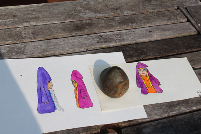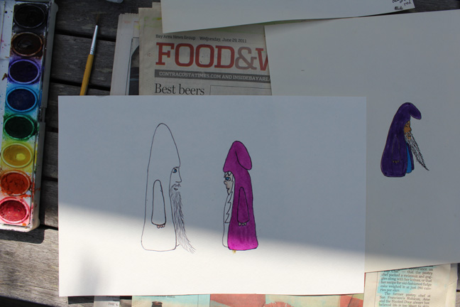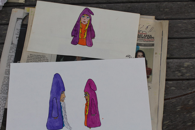 Well, there it all is, the original, amusing little comic strip that I drew when I was a teenager so many years ago… with all its ‘making fun of creation myth’ overtones… along with one of the watercolors… ( the flower picture up above)…that I keep at my mom’s house in the Bay Area for when I just feel like playing with watercolor paints. I am going to scan the flower picture and use it as one of the backgrounds. I will just use Photoshop to stick one of the pictures of Gadzooks, my little wizard, right inside it.