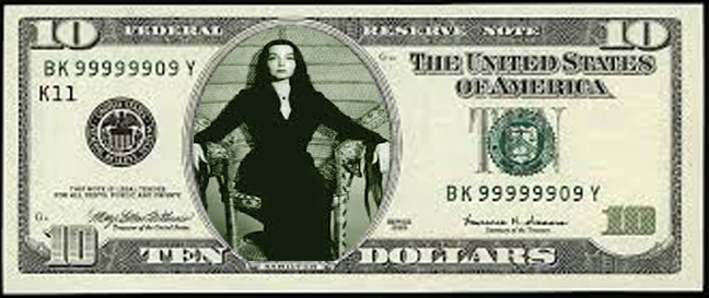 I honestly think that Morticia Addams would be awesome on a ten-dollar bill.