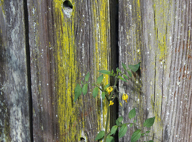 Those are tomato flowers, but look at the sweet moss growing on the fence.