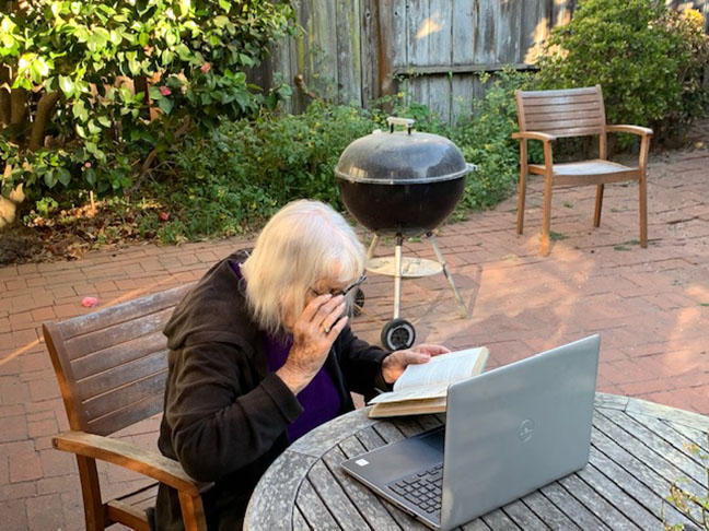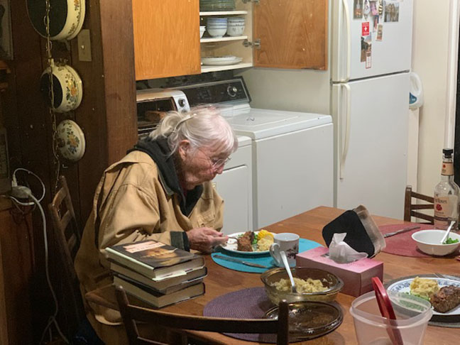My mom, using one of her bird books to identify bird from the pictures I take with a telephoto lens and then enlarge for her, because she can’t see too well anymore… or hear…