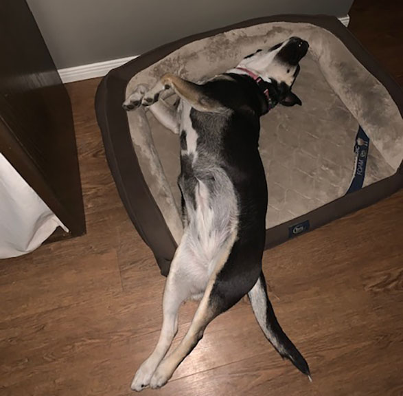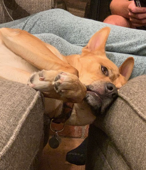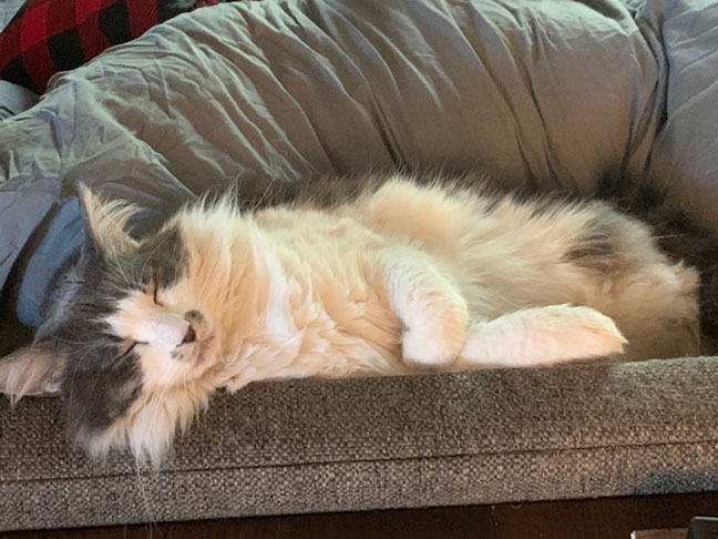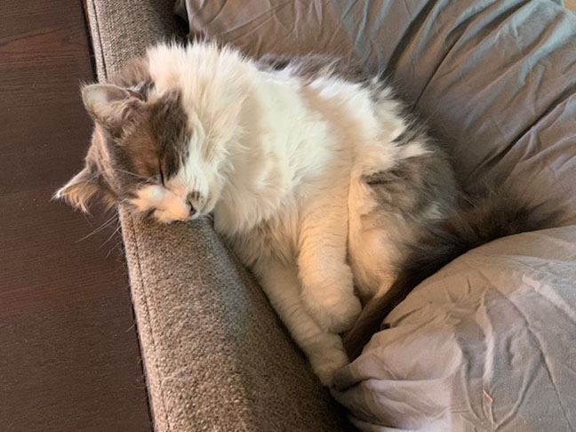 The cat sleeps on the top of one of the back-pillows on our couch.