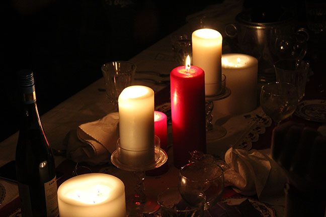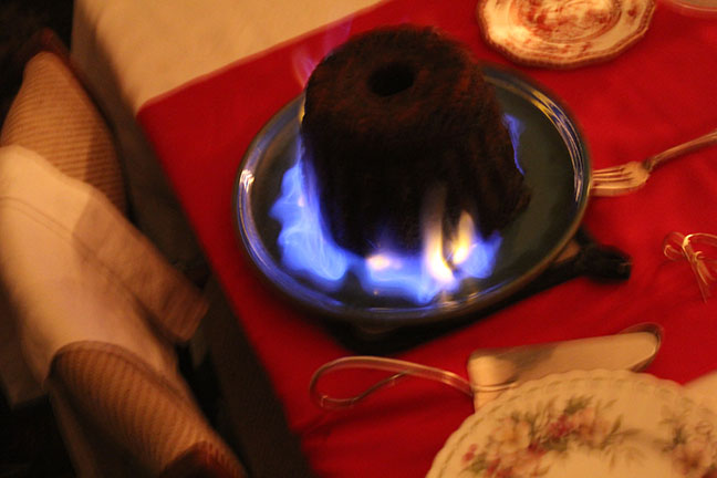 At the end of the meal comes the Plum Pudding, doused in liquor, and set ablaze. You can’t take a good photo because it is dark, and the shutter wants to stay open and the flash ruins everything anyway.