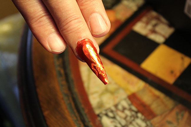 First of all, to clear things up, why did I have one fancy, flame and metallic-red, super long fingernail?