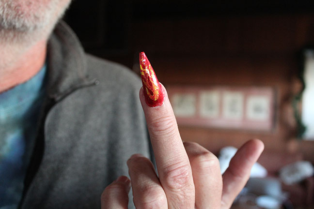 I went with the deep-red metallic background and the ever classy flames, on a long pointy nail so tRump wouldn’t miss my salute.