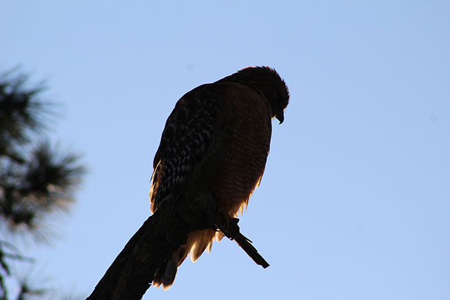 That very young Redtail Hawk I spotted near the elementary school I went to so many years ago. Shadows obscure his magnificent plumage, but the light throws his majestic form into relief.