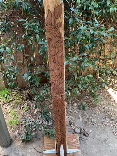 This post used to be the top of a taller post, and on that base on the bottom, which used to be the top, there was an owl box – a house for owls. Owls never used it. It had been there for a few years, so we – that is to say Mollie’s boyfriend Ben – took it down and cut up the post.