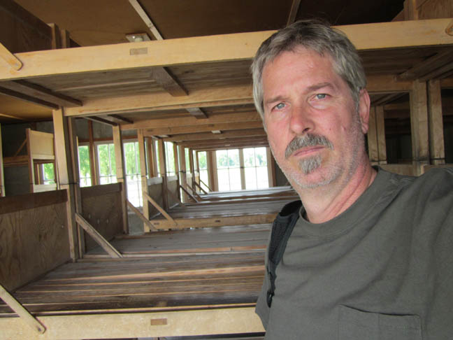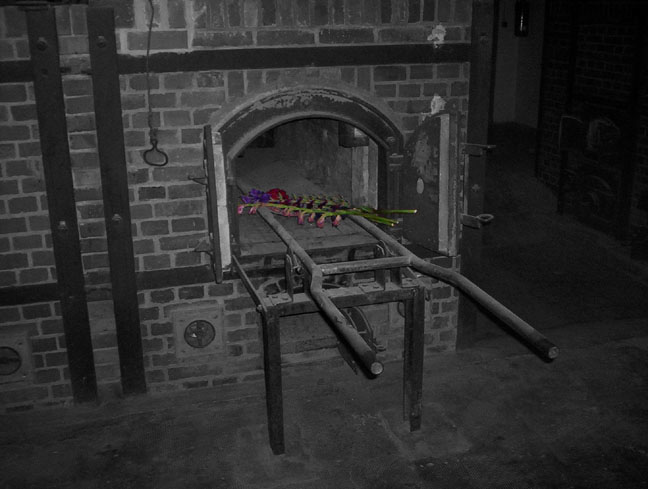 That is a photo I took at Dachau. I have been to Dachau twice. I removed the color from all of the photograph except for the flowers. I wanted the simple remembrance, the tribute of the flowers, to stand out more than the ovens used to burn the bodies of the victims of Nazi tyranny.
