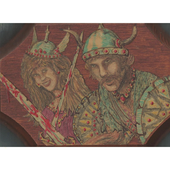 Where to start… well, a picture I did of me and my wife, before she was my wife, as barbarians, tie dye ninja, a drawing of a high school party I may have been at, and a bunch of weird stuff where I cut my head out of old photos and stuck them in things… like Civil War paintings, and a dinosaur’s mouth, a multimedia me as a pirate using ink, paint, glitter and real things cut out of a pirate article, and one gratuitous Conan picture I drew and mounted on wood, with him running from a rockslide.