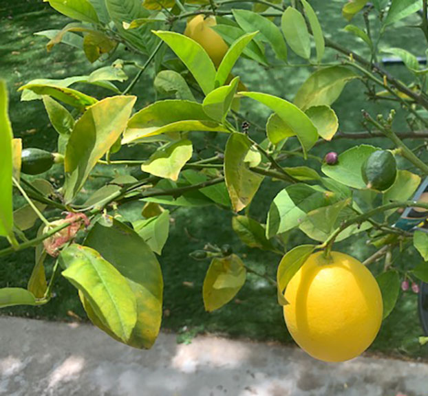 Our little potted lemon tree is making lemons and flowers.