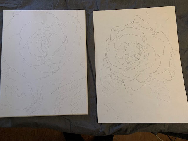 I have been using that digital image projector to do the sketching part of these paintings. Turns out that drawing the image isn’t the only hard part. Painting is hard too. Above, you see two of the pictures I am working on. They are both roses. One is an acrylic painting, and one is a watercolor.