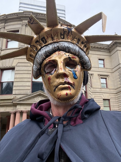Long story short, I decided to stage a one-man protest on the steps of City Hall, which is closed on Saturdays, it turns out, but I did not let that deter me. I stood there, without moving, for almost an hour. Because that is how long I paid for parking. I just let my eyes rest, and let the battered Lady Liberty speak for herself. I faced the oncoming traffic, and just kept my face, and the mask, slightly lowered.