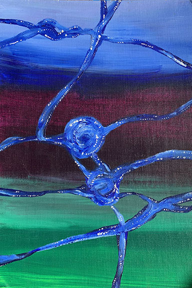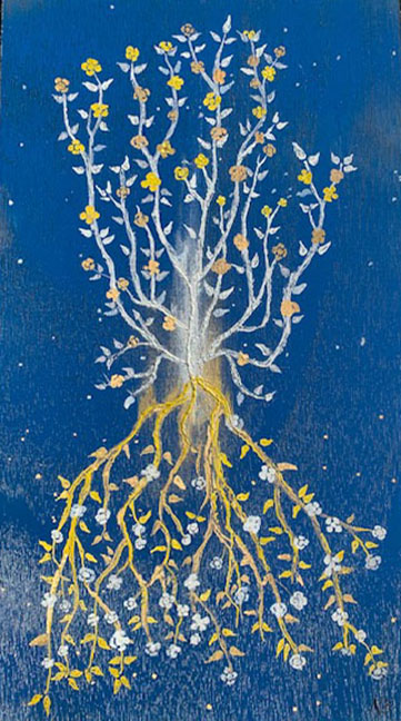 It isn’t a large piece. It is done on a wood panel, painted a lovely blue. The rest is all silver and gold. Not really sure if it is better this way, or turned upside down, but I guess I could turn it over on the wall now and then, and change the feel. Notice that the leaf and flow colors are switched between the ‘roots’/’branches and leaves and flowers.